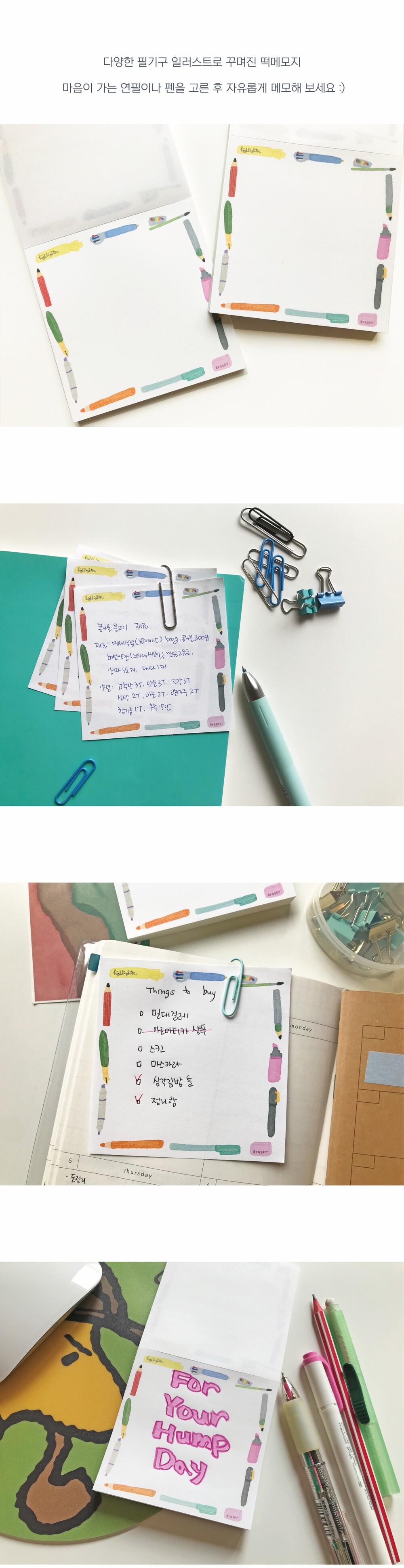 다양한 필기구 일러스트로 꾸며진 떡메모지