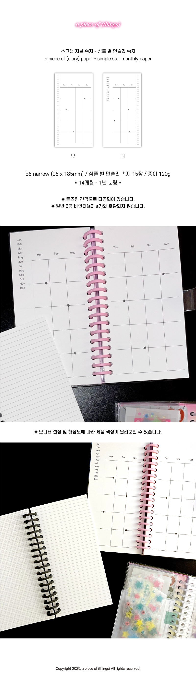 [어피스오브띵즈] B6 내로우 스크랩 저널 속지 - 심플 별 먼슬리 속지(15장)