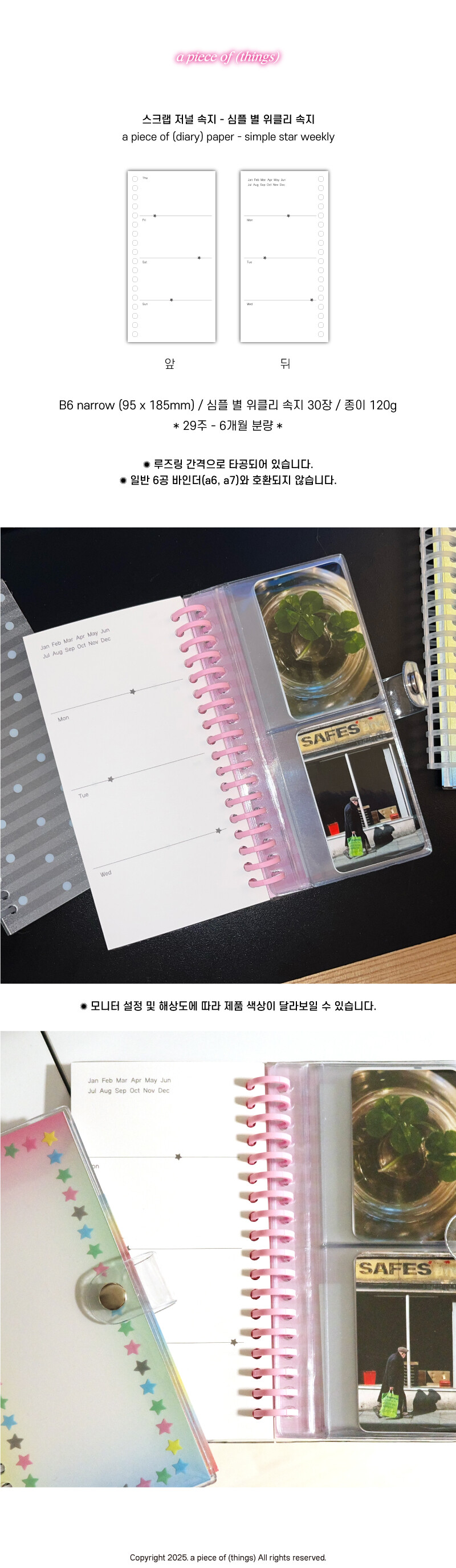 [어피스오브띵즈] B6 내로우 스크랩 저널 속지 - 심플 별 위클리 속지(30장)