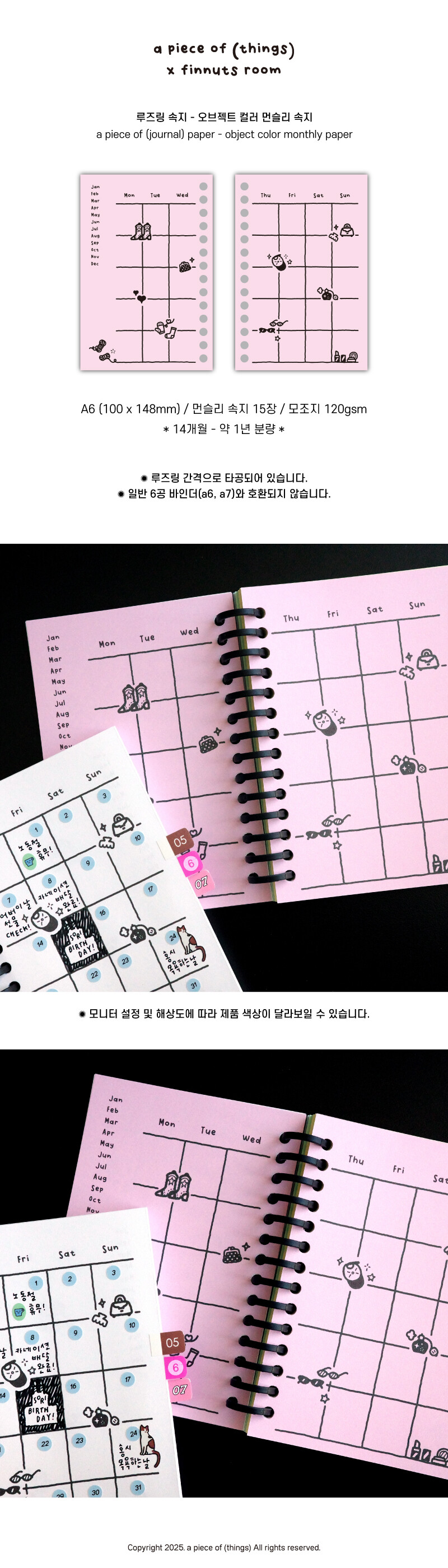 [어피스오브띵즈] 피너츠룸콜라보 A6 루즈링 속지 - 오브젝트 컬러 먼슬리 속지(15장)
