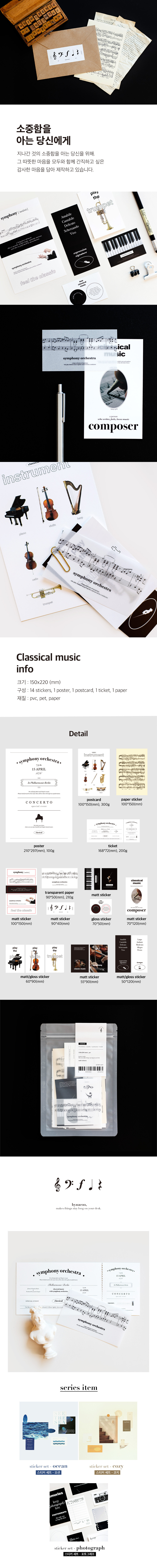 음악은 언제나 우리 곁을 지켜주는 소중한 친구입니다 🎼 그 중에서도 클래시컬 뮤직은 시대를 초월해 사랑받고 있어요. 음악가들이 담긴 발자취를 조금 더 가까이, 클래시컬 뮤직을 가까운 곁에서 느낄 수 있는 스티커와 포스터, 엽서, 티켓, 페이퍼들이 한 세트에 담겼습니다. 다채로운 구성들로 다이어리 속 감성은 물론 데스크테리어 등 인테리어에도 함께해보세요 🎻
